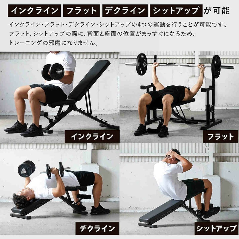 ・インクライン・デクライン・フラットに加え、シットアップ機能も搭載。