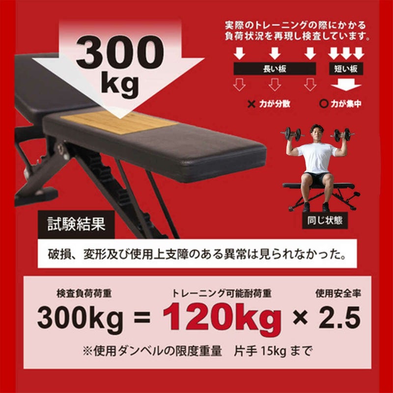 耐荷重は120kgです。なお、トレーニング時に使用できるダンベルの重量は片手15kgまでが限度となっております。
