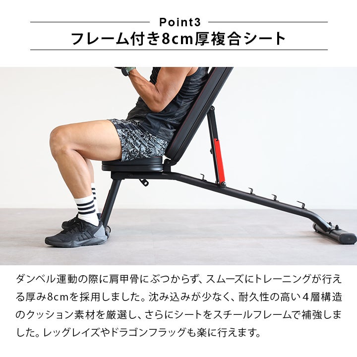 本製品の耐荷重は300kgとなっており、高重量のダンベルやバーベルを使用したトレーニングにも対応しています。また、フラット時の安定性を高める三点フレーム構造を採用しています。
