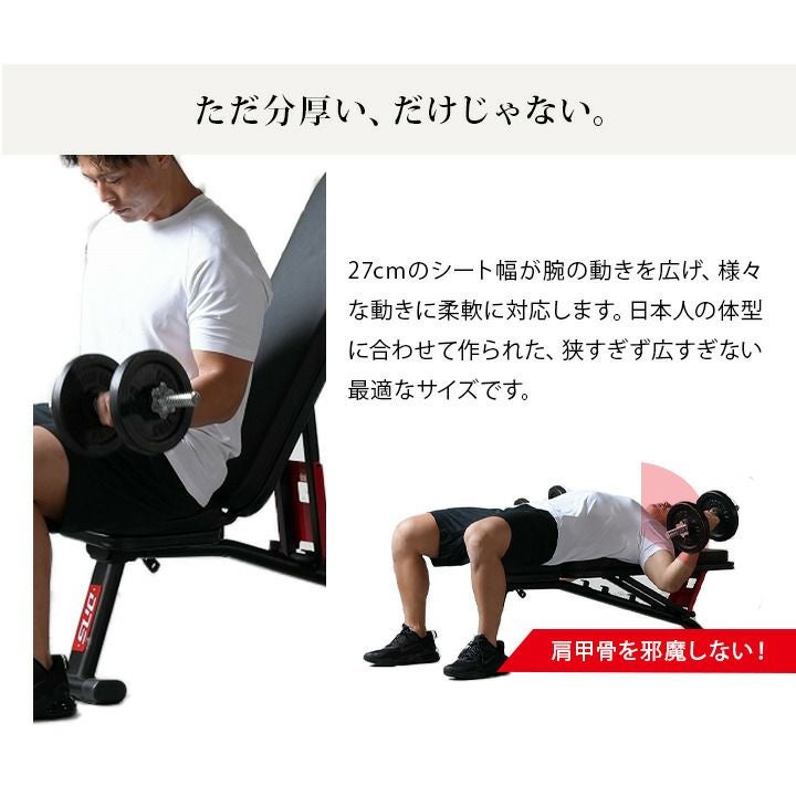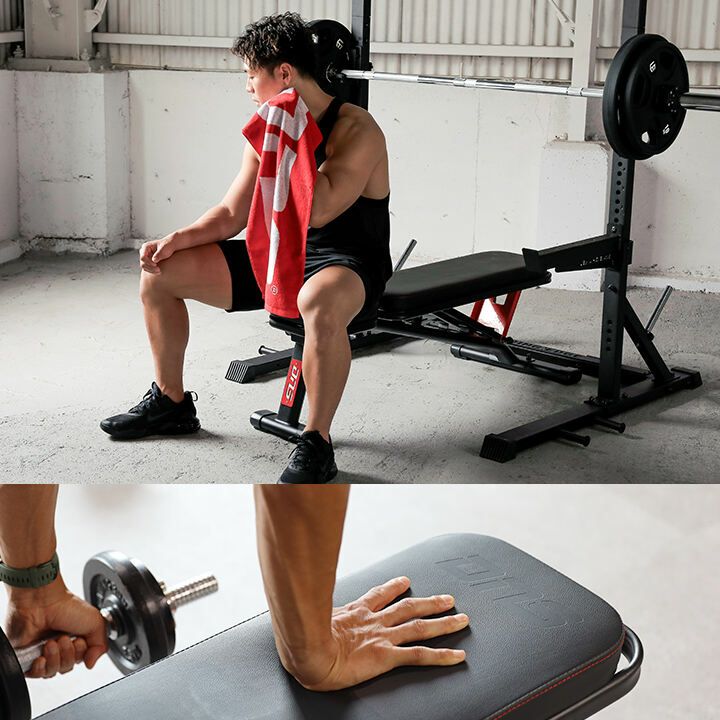 ※背もたれは角度変更式のため・高重量のバーベルトレーニングは必ずセーフティスタンド等安全器具を利用して運動してください。