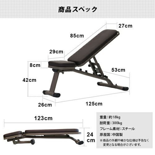 使用時のサイズは長さ125cm×幅54cm×高さ42-123cm、重量は約18kgです。耐荷重は300kgで、高重量のトレーニングにも対応しています。
