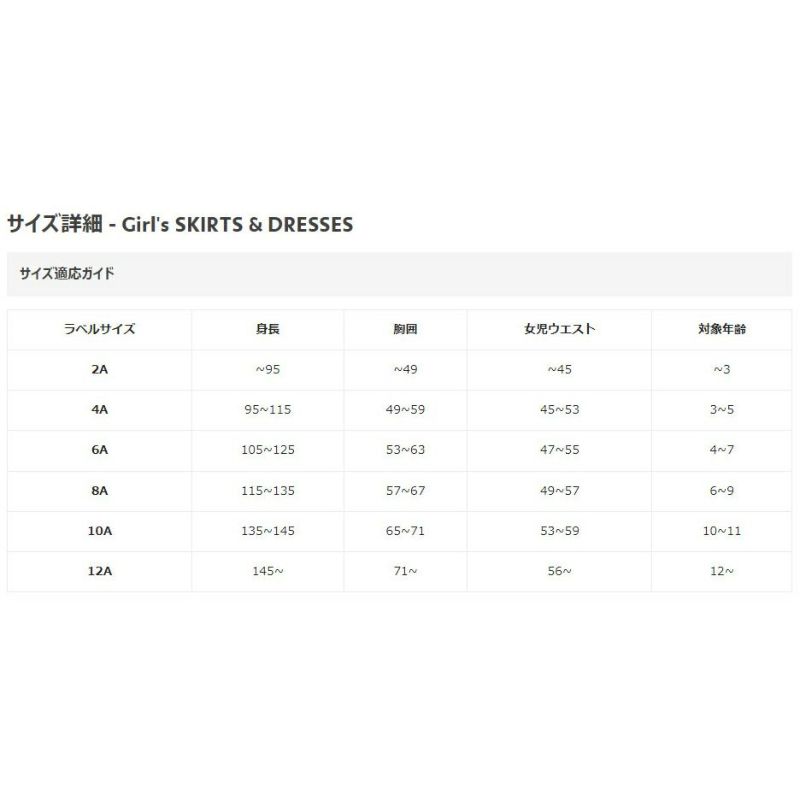 12A:身長145-、胸囲71-、女児ウエスト56-、対象年齢12-