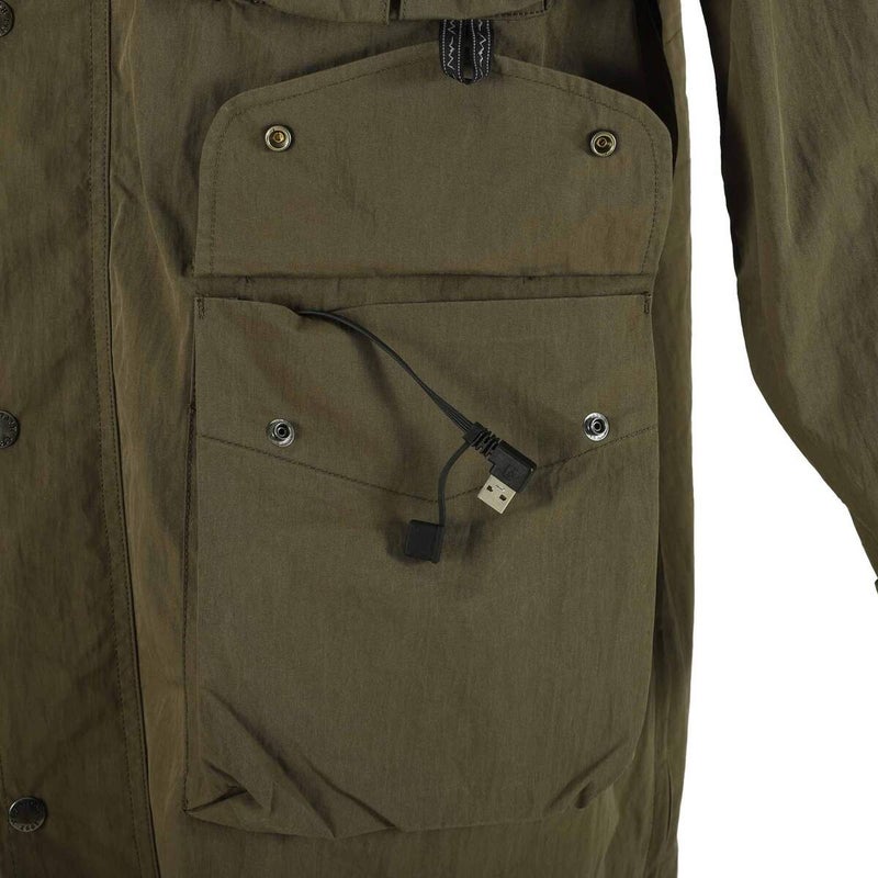 市販の携帯バッテリーを、左ポケットのUSBプラグに繋いで使用します。