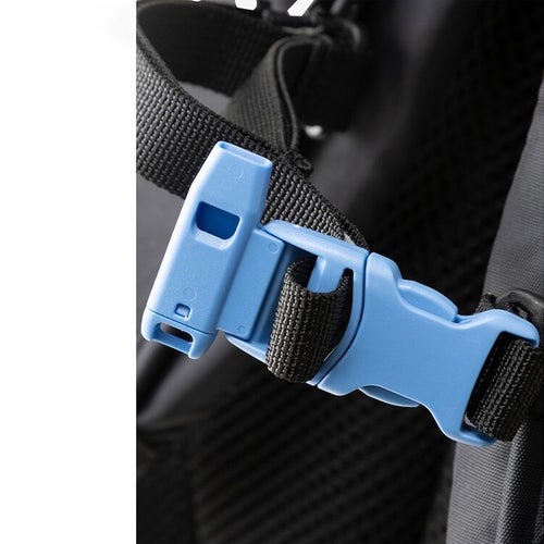 ・一定の荷重がかかると開放するホイッスルつきのチェストバックル。