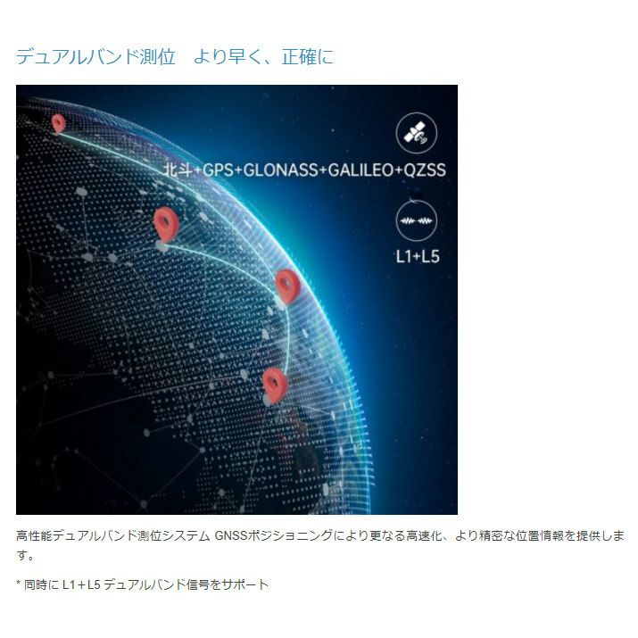 高性能デュアルバンド測位システム GNSSポジショニングにより更なる高速化、より精密な位置情報を提供します。