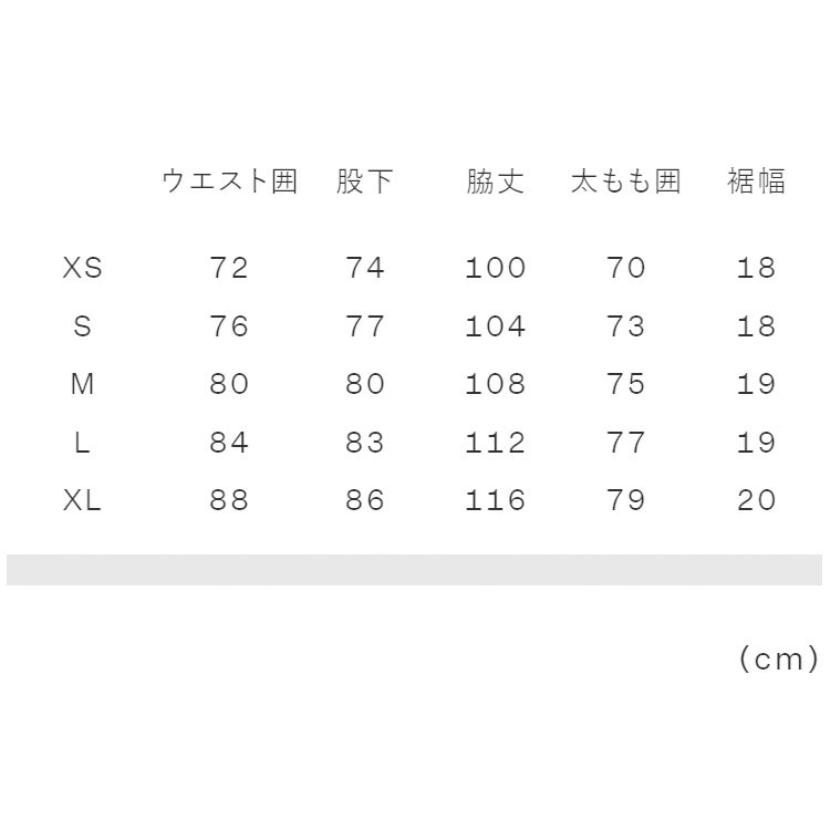 実寸サイズ(cm)XS:ウエスト囲 72、股下 74、脇丈100、太もも囲70、裾幅18