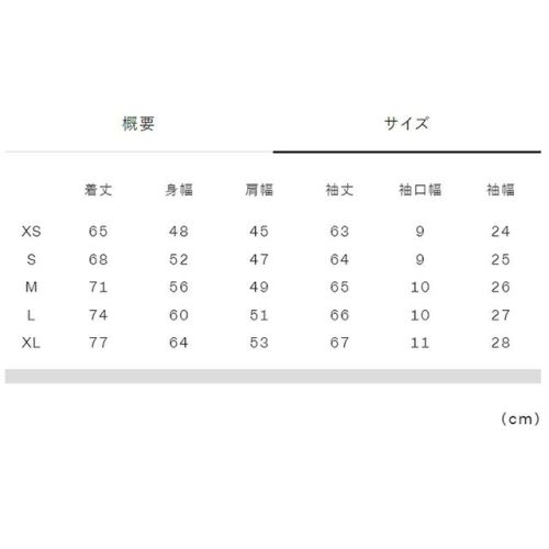 XS:着丈65、身幅48、肩幅45、袖丈63、袖口幅9、袖幅24 S:着丈68、身幅52、肩幅47、袖丈64、袖口幅9、袖幅25 M:着丈71、身幅56、肩幅49、袖丈65、袖口幅10、袖幅26 L:着丈74、身幅60、肩幅51、袖丈66、袖口幅10、袖幅27 XL:着丈77、身幅64、肩幅53、袖丈67、袖口幅11、袖幅28 |