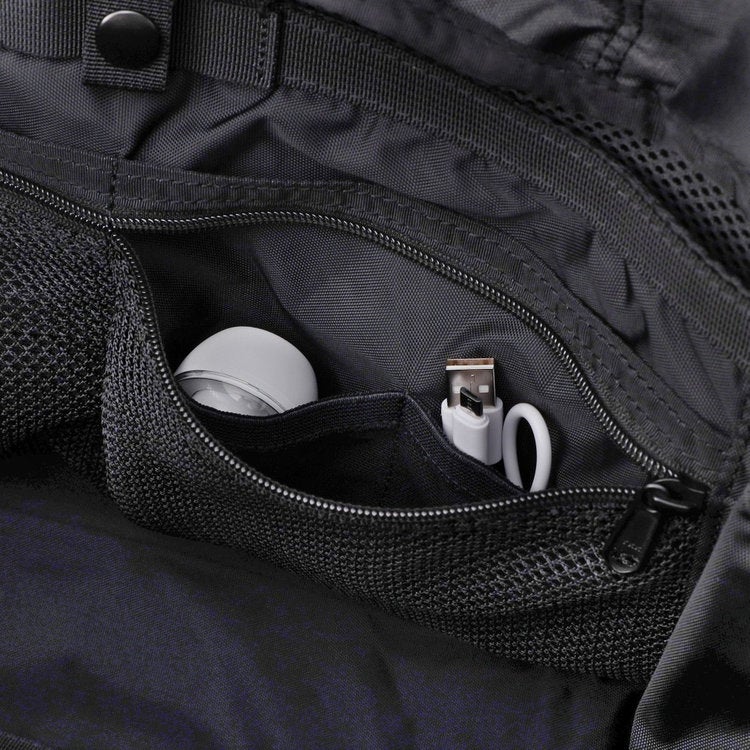 PCスリーブの近くに、ケーブルなどの収納に最適なメッシュポケットを配置するなど、関連する荷物がバラバラにならないように配慮。