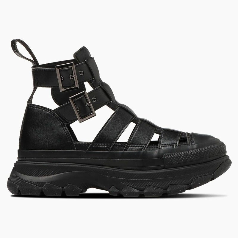 オールスターの定番スタイルに、トレッキングシューズを思わせるボリューム感あふれるアウトソールを融合させたトレックウェーブを、グラディエーターパターンのブーツをモチーフにしたデザインを採用。