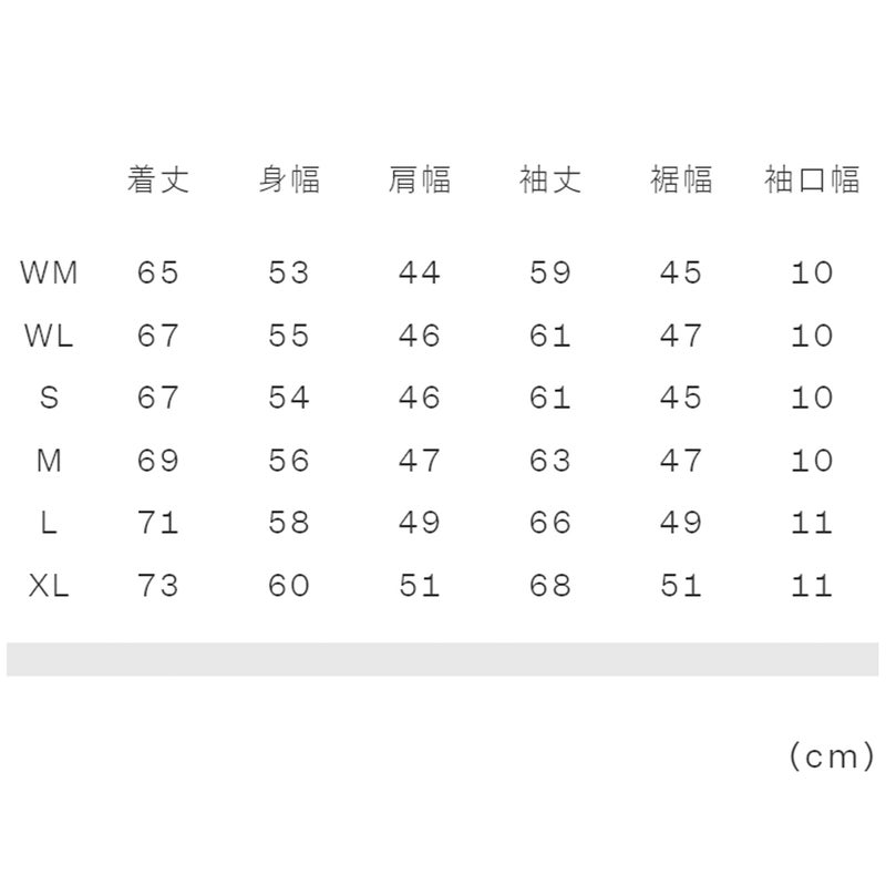XL:着丈73、身幅60、肩幅51、袖丈68、裾幅51、袖口幅11