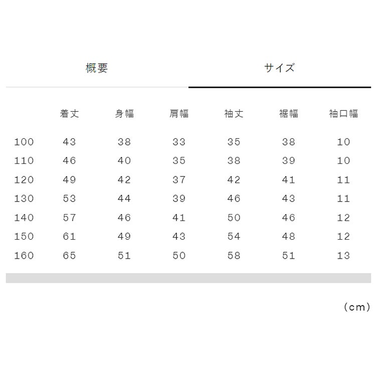 実寸サイズ(cm)100:着丈43、身幅38、肩幅33、袖丈35、裾幅38、袖口幅10