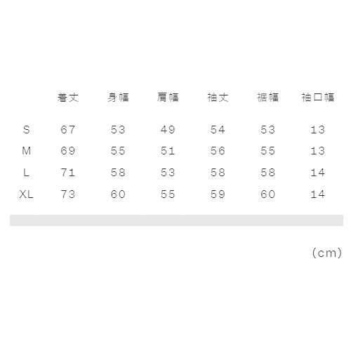 XL:着丈73、身幅60、肩幅55、袖丈59、裾幅60、袖口幅14