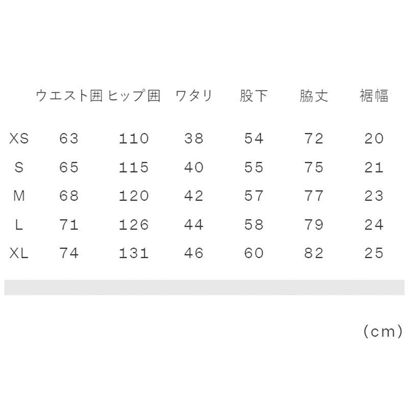 実寸サイズ(cm)XS:ウエスト囲63、ヒップ囲110、ワタリ38、股下54、脇丈72、裾幅20