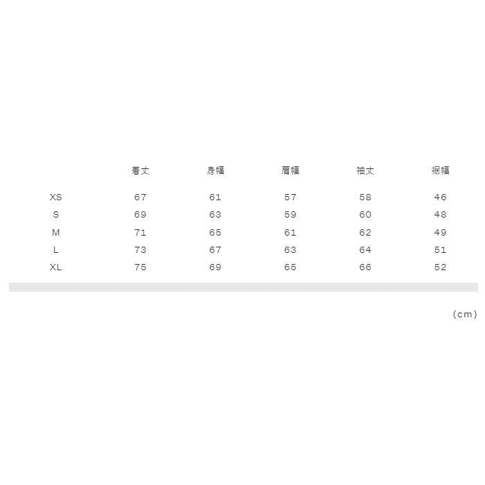 実寸サイズ(cm)XS:着丈67、身幅61、肩幅57、袖丈58、裾幅46