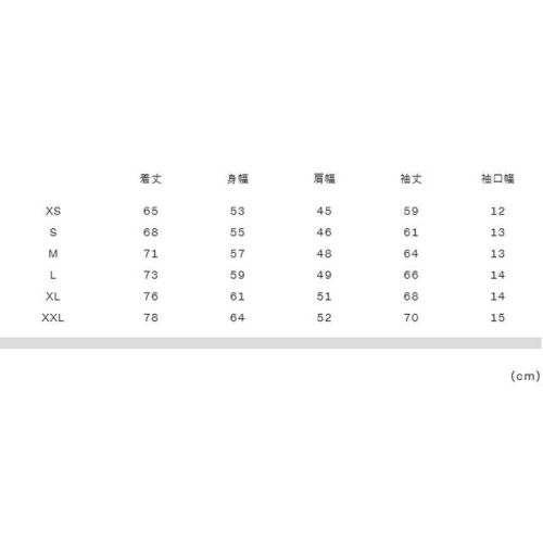 XS:着丈65、身幅53、肩幅45、袖丈59、袖口幅12 S:着丈68、身幅55、肩幅46、袖丈61、袖口幅13 M:着丈71、身幅57、肩幅48、袖丈64、袖口幅13 L:着丈73、身幅59、肩幅49、袖丈66、袖口幅14 XL:着丈76、身幅61、肩幅51、袖丈68、袖口幅14 XXL:着丈78、身幅64、肩幅52、袖丈70、袖口幅15 |