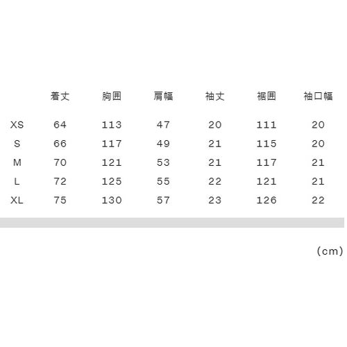 実寸サイズ(cm)XS:着丈64、胸囲113、肩幅47、袖丈20、裾囲111、袖口幅20