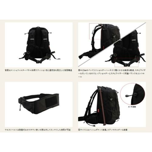 ・厚み12mmのパッド入りショルダーハーネスで肩にかかる負担を軽減、スタビライザーも付いているのでヒップショルダーとスタビライザーで荷重バランスをコントロール。
