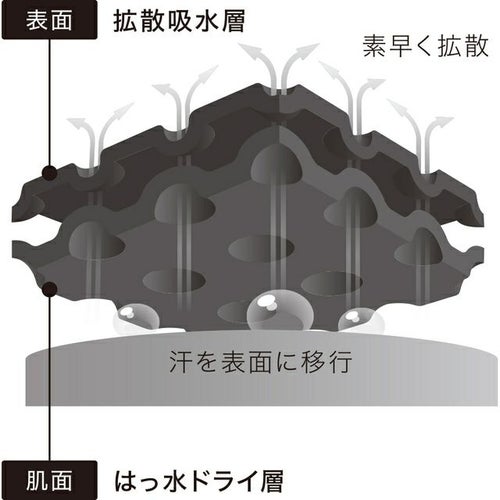 生地は、肌面にはっ水加工を施したドライ層を用い、表面は汗を素早く拡散し乾燥させる吸水層で構成したダブルフェイス構造。