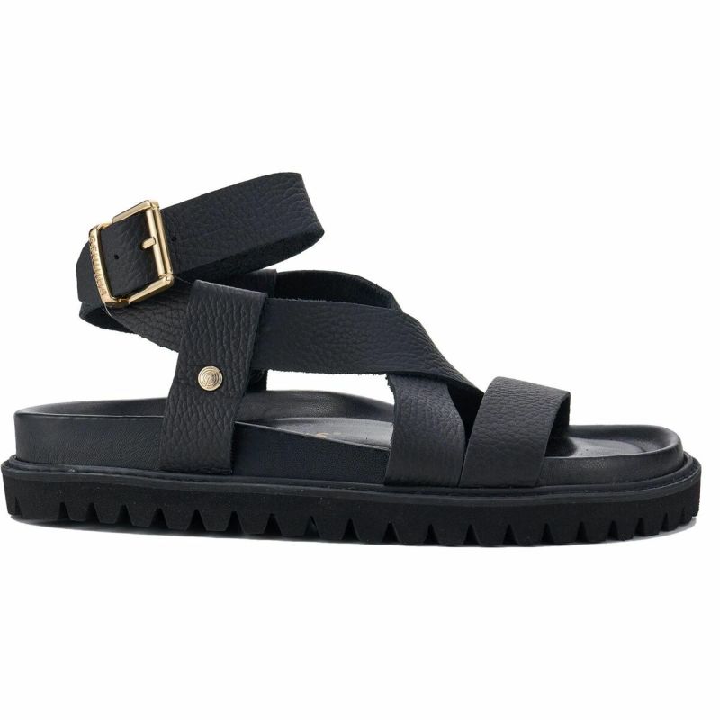 甲に交差したストラップと足首で調整可能。