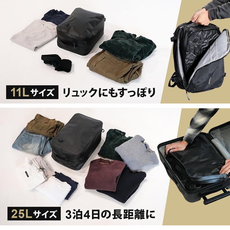 ・11Lサイズ(Mサイズ):バックパックやリュックに収まるサイズ感で、1~2泊程度の短期出張や旅行での小分け収納(トラベルポーチ)として最適です。