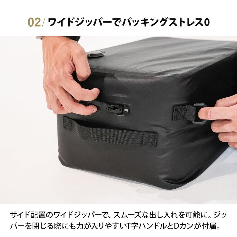 傷や摩耗に強い耐久ナイロン素材(PU/TPUコーティング)に、無縫製ウェルダー加工と気密ジッパーを採用。