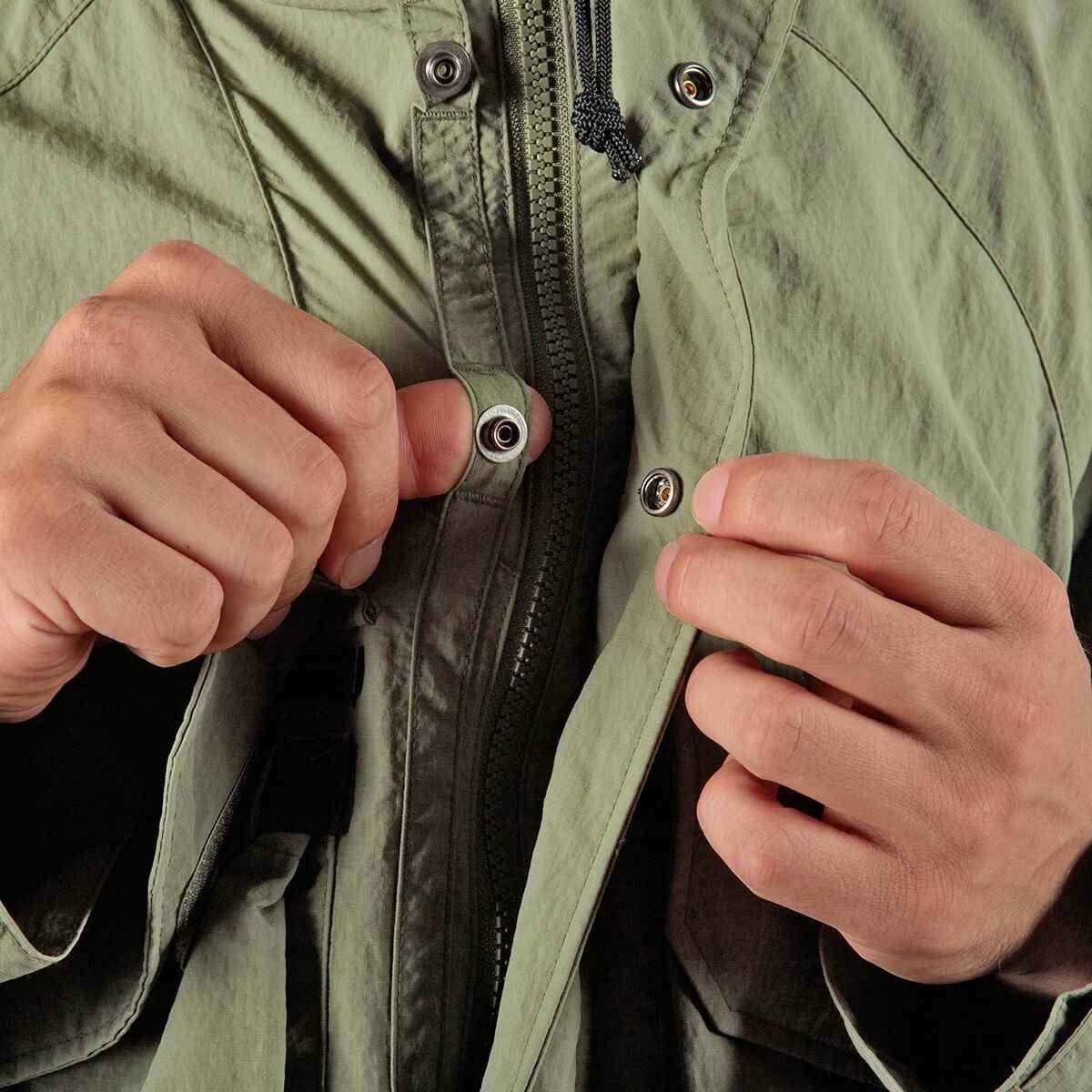 フィッシングシーンでも実用的な、両胸に大型のマチ付きフラップポケット、両脇にハンドウォーマーを備えています。