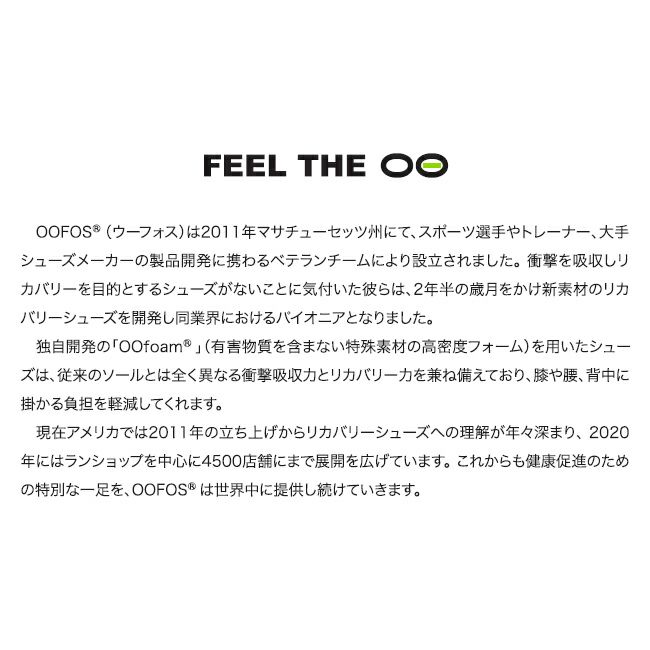 「OOFOS(R)」ウーフォスは、2011年にマサチューセッツ州のコハセットでスポーツ選手やトレーナー、大手シューズメーカーの製品開発に携わるベテランチームにより、2年半の歳月をかけ開発されたリカバリーシューズブランドです。
