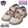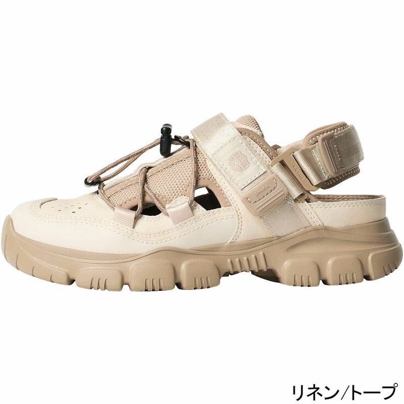 本革のような風合いで耐久性のあるPUレザー&ちらりと肌見えもする通気性の良いメッシュ素材に、太めのコードを組み合わせたアウトドアスタイルのアッパーデザインが印象的なスニーカーサンダル。