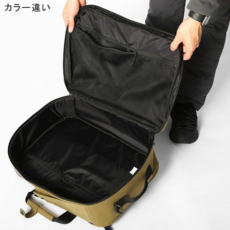 ・スーツケースのように大きく開き、中にも仕切りやメッシュのポケット、フロントには2つのファスナーポケットを配置。