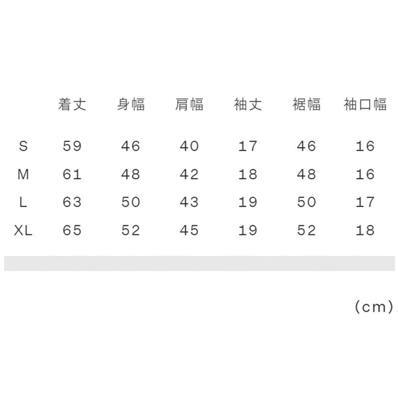 実寸サイズ(cm)S:着丈59、身幅46、肩幅40、袖丈17、裾幅46、袖口幅16