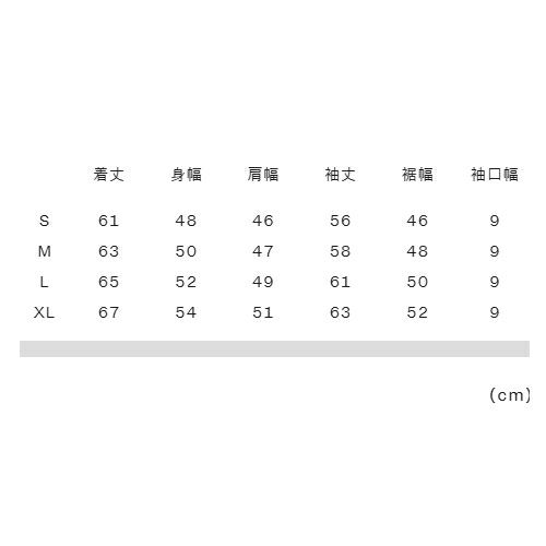 実寸サイズ(cm)S:着丈61、身幅48、肩幅46、袖丈56、裾幅46、袖口幅9