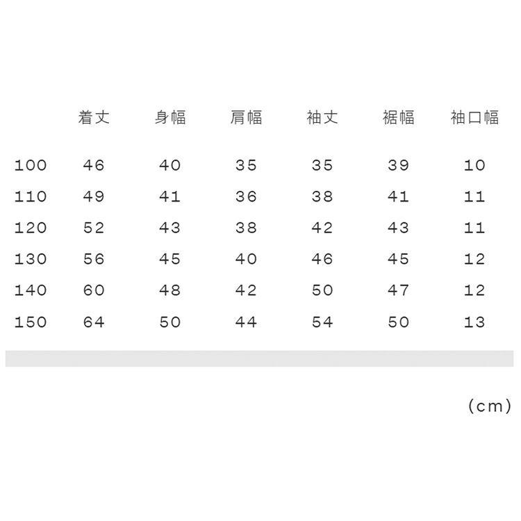 実寸サイズ(cm)100:着丈46、身幅40、肩幅35、袖丈35、裾幅39、袖口幅10