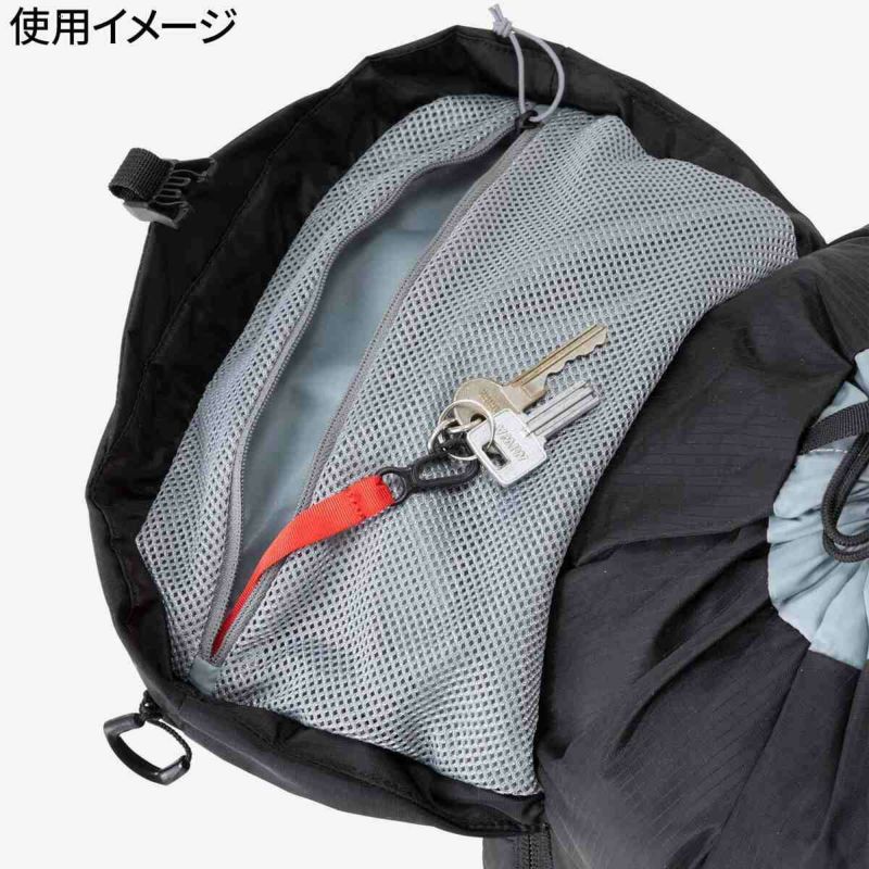 ・雨蓋裏面にはキークリップ付きファスナーメッシュポケット。
