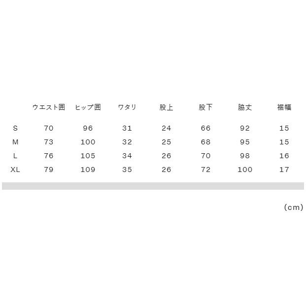 XL:ウエスト囲79、ヒップ囲109、ワタリ35、股上26、股下72、脇丈100、裾幅17