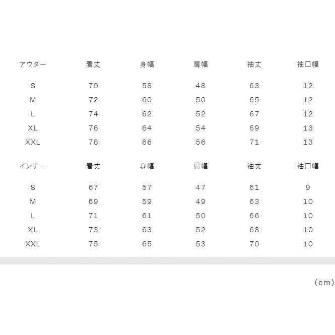 XXL:着丈78、身幅66、肩幅56、袖丈71、袖口幅13