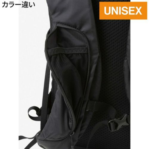 両サイドにはストレッチメッシュポケットと、右ショルダーハーネス部分に収納式のボトルポケットを装備。