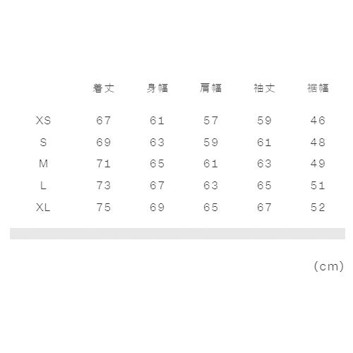 実寸サイズ(cm)XS:着丈67、身幅61、肩幅57、袖丈59、裾幅46