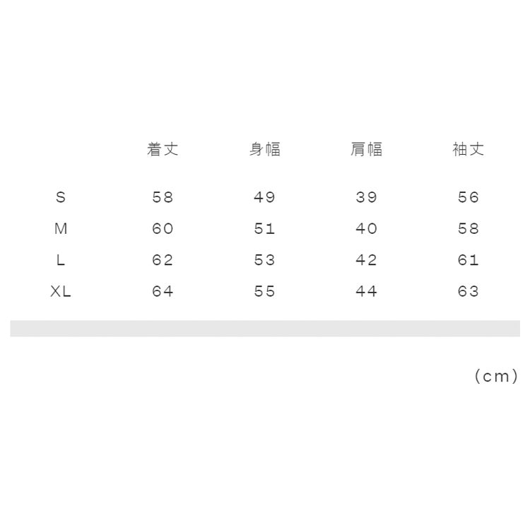 実寸サイズ(cm)S:着丈58、身幅49、肩幅39、袖丈56