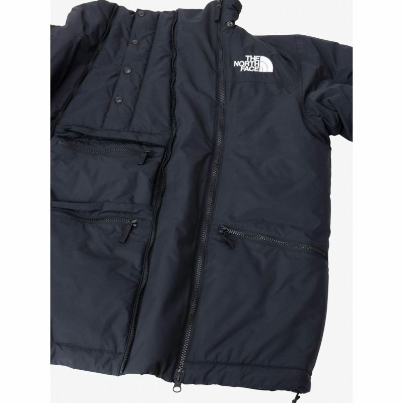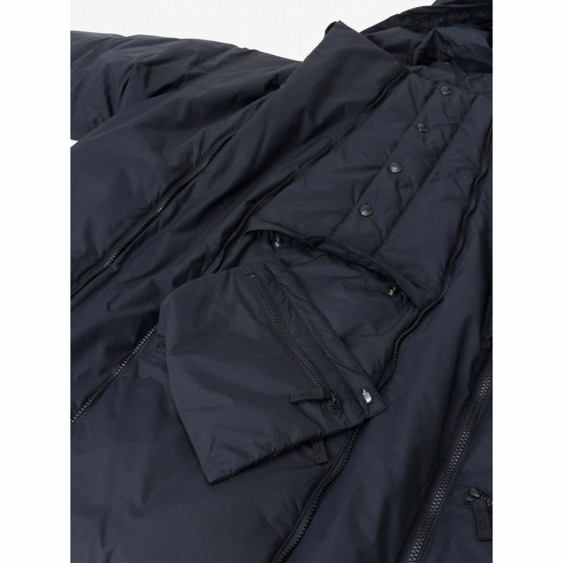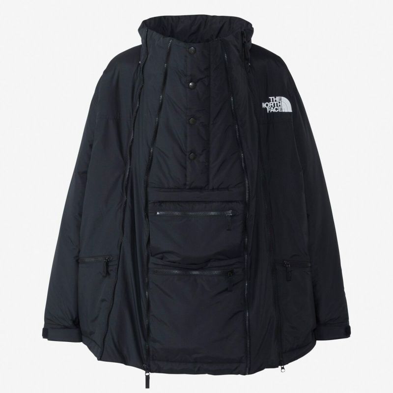 ファスナーを開くとマチが広がるエクスパンダブル仕様により、子供を抱っこした上から着用できる中わた入りジャケット。