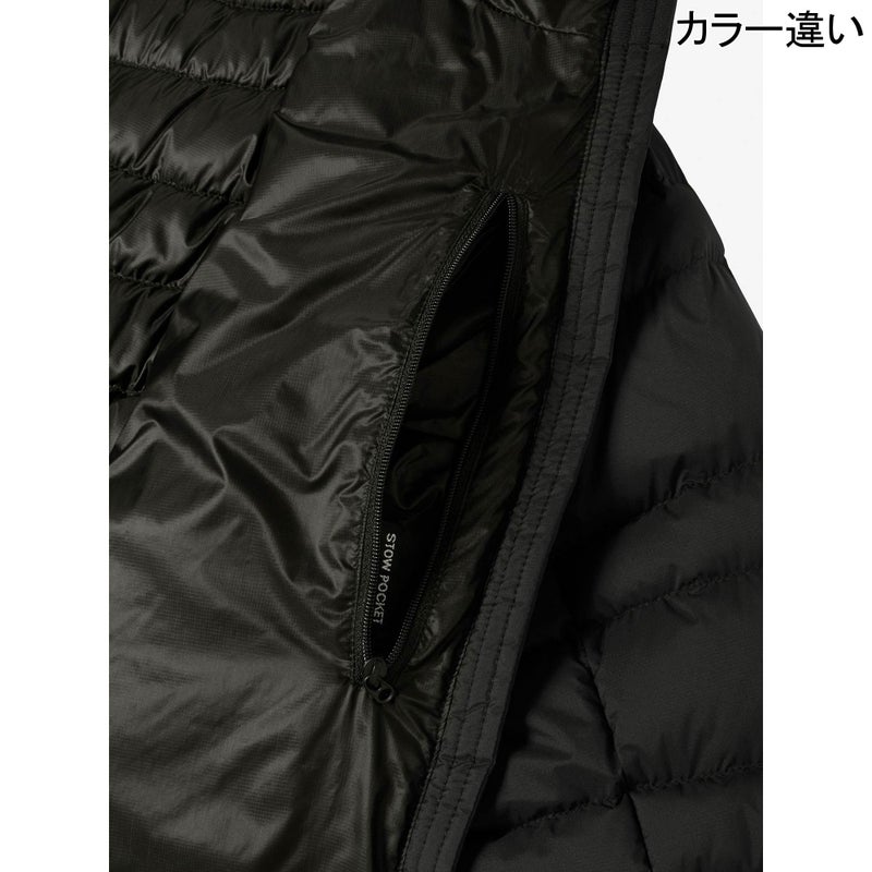 ダウンと化繊わたの軽量ハイブリッドダウンのフード付きジャケット。