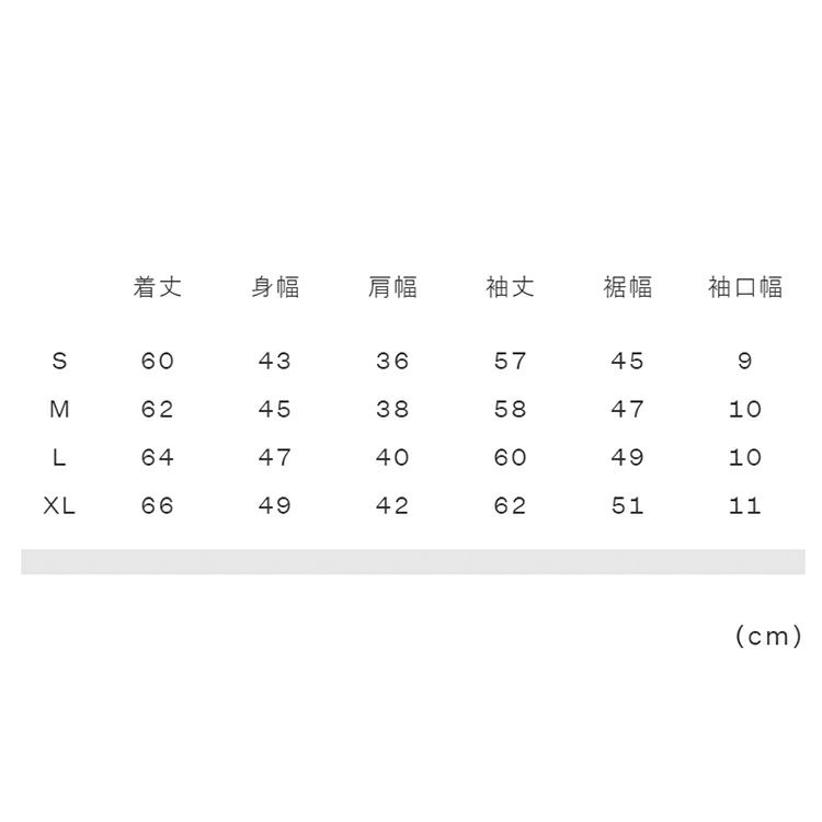 実寸サイズ(cm)S:着丈60、身幅43、肩幅36、袖丈57、裾幅45、袖口幅9