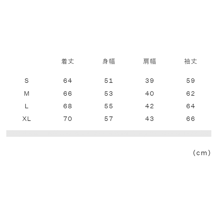 実寸サイズ(cm)S:着丈64、身幅51、肩幅39、袖丈59