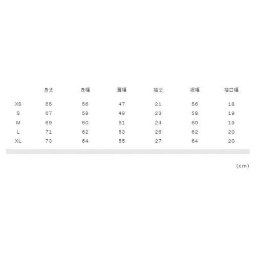 XS:身丈65、身幅56、肩幅47、袖丈21、裾幅56、袖口幅18 S:身丈67、身幅58、肩幅49、袖丈23、裾幅58、袖口幅19 M:身丈69、身幅60、肩幅51、袖丈24、裾幅60、袖口幅19 L:身丈71、身幅62、肩幅53、袖丈26、裾幅62、袖口幅20 XL:身丈73、身幅64、肩幅55、袖丈27、裾幅64、袖口幅20 |