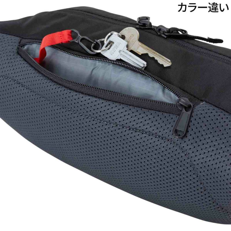 背面には、キークリップを内蔵したファスナー付きポケットを備えています。