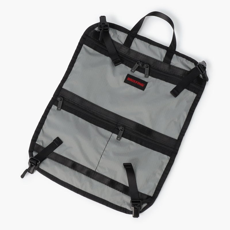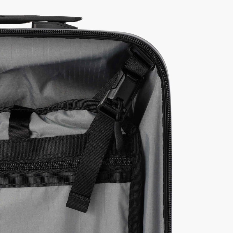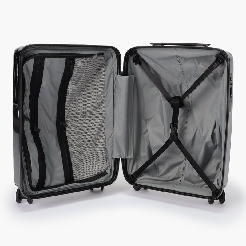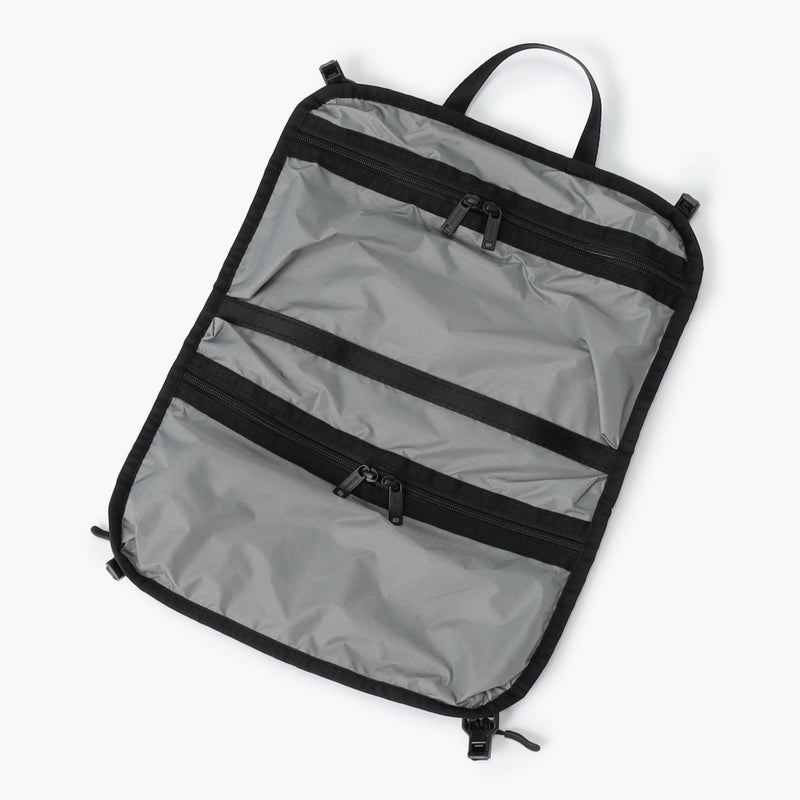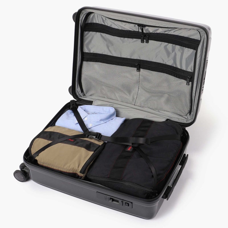 ・中面には収納アイテムの視認性に優れるメッシュポケットのほか、滞在先のホテルウォールポケットとして使用できる仕切り板を搭載。