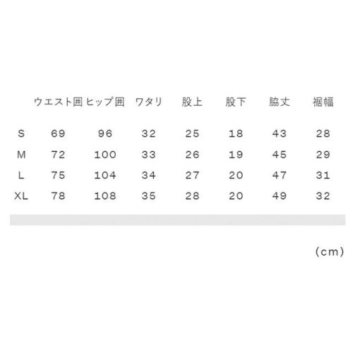 S:ウエスト囲69、ヒップ囲96、ワタリ32、股上25、股下18、脇丈43、裾幅28 M:ウエスト囲72、ヒップ囲100、ワタリ33、股上26、股下19、脇丈45、裾幅29 L:ウエスト囲75、ヒップ囲104、ワタリ34、股上27、股下20、脇丈47、裾幅31 XL:ウエスト囲78、ヒップ囲108、ワタリ35、股上28、股下20、脇丈49、裾幅32 |