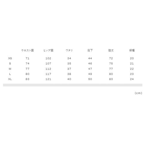実寸サイズ(cm)XS:ウエスト囲71、ヒップ囲102、ワタリ34、股下44、脇丈72、裾幅20