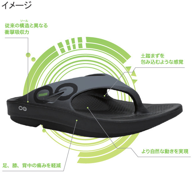 OOFOS(R)製品に使われている特殊素材OOfoamは、前進力を生むことを目的とした一般的なEVA素材のミッドソールと異なり、衝撃の反発を37%抑えることができ着地による足裏への衝撃を軽減することができます。