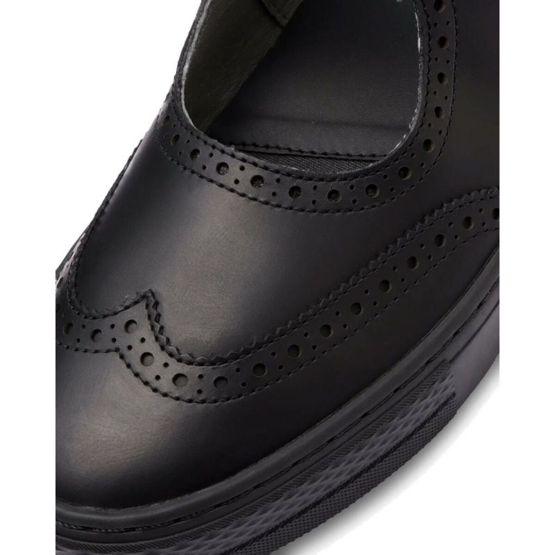 ほどよい光沢のあるブラックレザーに、ウィングチップパターンでブローギング(穴飾り)をあしらったデザイン。