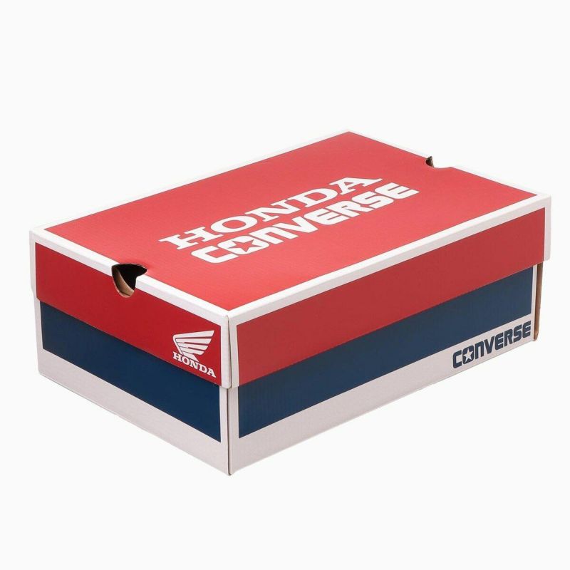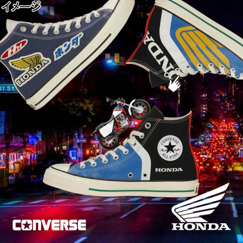 レーシングシャツの特徴的な切り替えをプリントで表現したアッパーに、Hondaの二輪のエンブレムである「ウィングマーク」とHondaのコーポレートロゴを散りばめたインパクトのあるデザイン。